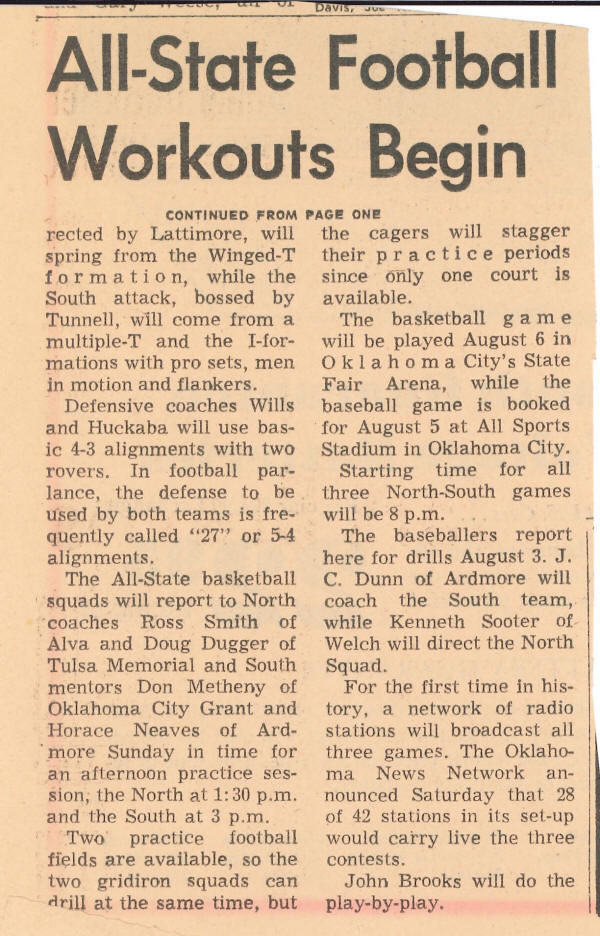 Zebs Hit Hard Again; North Dons Pads Today By DOYLE MAY EDMOND — The South footlx forces moved head of their Northern adversies Monday _ )y the practice timetable, at let. ed their irges through a South coaches hustl lard-hitting scrimmage Mond fternoon while lie Yankees again went thr . a "dummy" Trill as coaches sought to e ish an offense. "We're trying to avoid earl:(ntact that might produce some injuries," reptd Jim Wills of Skiatook, who teams with ry Lattimore of Sallisaw and Buddy Murrell herokee to coach st time Tuesday the North. "We'll hit for thr afternoon." f Lindsay, Rene South coaches Joe Tunn) ke felt their squad Huckaba of Yukon and Phil "accomplished a lot, especially on defense" during the scrimmage at Central State College where every All-State team is housed. Tunnell said the South has no injuries thus far. The North has reported no injuries either. Striking from an I formation with some winged-T plays, the Rebel running game was more effective than the aerial attack Monday. "I'm afraid we're not going to be a passing team," said Dalke, -but with the linemen and big backs that we've got, we should have a strong ground attack." Tunnell and Dalke agreed that Clinton's James Williams, everybody's back-of-the-year last fall, "ran very well." Dalke said Lindsay halfback Steve Dodd (6-3, 195) also looked good. Williams (6-2, 203 ) sparked Clinton to the Class A championship last year by rushing for an incredible 2,079 yards. Lee Wayne Wood (5-11, 185) of Ardmore emerged as the No. 1 quarterback. "We used Wood more than the other two quarterbacks (Lester Cavins of Poteau and Mike Secrest of Wewoka) because we feel he's ahead right now.'' Wood, a fine thrower, earned All-State honors because of his linebacking ability after an early-season injury forced him to switch to halfback for coach Tip Jacobson. Dalke said McAlester's Walter Rhone (6-0, 155) was the best of the South receivers Monday. -It was a typical first scrimmage," remarked Tunnell, whose Lindsay team reached the state Class A semifinals the past two years. "Naturally, the defense was ahead of the offense. We tried a lot of passes, but weren't too successful. However, Wood can throw the ball straight and far." Tunnell said Ray Hamilton, a 200-pound middle guard from Douglass, was the best defensive player on the field. He praised the offensive tackle play of 220-pound Jay Cruse of Lindsay and 30-pound Anthony Gaeddart of Capitol Hill. "lat little fellow from Midwest City ,-, (160- pou vinnn l had a good day," Tun "is Jo west's Class AAA runners-up, is being used at offensive center and defensive guard. He's up to 270, one of his coaches said. "I think we looked pretty good for only our fourth workout. Everyone has a great attitude. They came to play. We've had some good practices," Tunnell concluded. Over the hill at the North camp, coach Wills said the Yankees "have a lot of good players. I'm impressed by the mannerly way in which these young men conduct themselves. I guess that comes from being good athletes. We haven't done er----L the field to rank any players yet.- he 011 4 ;.„ 7:777.7,7777.7 • u-) th defensive coach Rene Huckaba of Yukon 3.'4. the Rebel defenders through a hard-hitting •:7 drill during preparations for the North-South all- star game. Staff photo by Ed Sokolosky Injuries Clear Up Huckaba's Defenders Primed By AL ESCHBACH EDMOND — Things have started to fall into place for the South's defensive ,unit and no one is happier than Rene Huckaba. Huckaba, head coach at Yukon who is handling the Rebels defense as they get ready for their August football clash with the North All-Stars at Taft Stadium, thinks his forces are just about ready for anything the Yanks throw at him. "Things are really starting to look good. This morning we had the best reading drill yet," gleamed Huckaba after the afternoon practice session was completed. When Huckaba talks about his defense, one of the first names he brings up is tackle Ray Hamilton, known by his teammates as "Sugar Bear." The Douglass product, who is heading for the University of Oklahoma this fall, has drawn nothing but praise from Huckaba. "He's going to be a good one," said Huckaba. Not only does he have the size, but he has terrific speed. "He's been running with the halfbacks here." Huckaba also singled out the play of Ada's • Gary Rhynes, who had been moved from offensive end to linebacker. "He looked sharp out there," chirped Huckaba. Over on the South's offensive side, it continued to work on its passing and kick-_ ing game with no heavy contact in sight until Monday. "Our injury situation is quite a bit better now," said coach Joe Tunnell. "Steve Dodd (Lindsay) returned today running at halfback. He's at about 50 per cent effectiveness. "Walter Rhone (McAlester) was back at wingback and looked good, and Don Rinkle (U.S. Grant) returned at fullback." James Williams of Clinton, the No. 1 fullback who missed practice Wednesday due to a funeral, was back with the squad. Northwest's John Carter, who had pulled a muscle earlier in the week, is expected to workout Friday. Carter was in a sweat suit Thursday and did some centering for the offense. "Our passing game is coming along better," Tunnell said. "We are getting acquainted with the patterns and are running them a lot more smoothly. " Lee Wayne Wood of Ardmore continued to hold down the first team berth. The North continued to hit more than the South as they started to fit players into various positions. The quarterback battle has been cut to two players. The starter should come from either Rod Warner of Stillwater or Steve Williams of Collinsville. Larry Roach of Watonga has been moved over to defense. The Yank had two casualties on the sidelines with minor injuries. Wingback Tom Zackery of Tulsa Washington and Gordon Williams of Enid did not participate in the contact. South basketball coaches Don M.etheny of U.S. Grant and Horace Neaves of Ardmore continued to speculate. on how their 